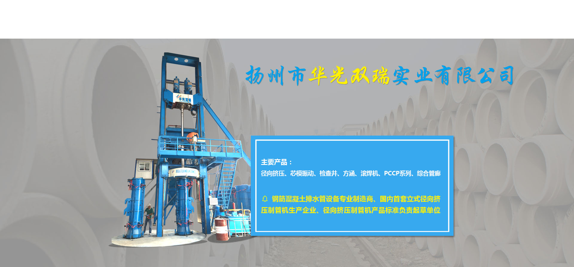 ????????揚(yáng)州市華光雙瑞實(shí)業(yè)有限公司,位于中國(guó)歷史文化名城揚(yáng)州市東郊江都區(qū)丁伙工業(yè)園區(qū),公司成立于2000年10月,是一家專門(mén)致力于鋼筋混凝土排水管生產(chǎn)裝備的設(shè)計(jì)開(kāi)發(fā)、加工制造、銷(xiāo)售服務(wù)的專業(yè)制造商。公司2016年度被授予全國(guó)建材機(jī)械產(chǎn)品定點(diǎn)生產(chǎn)企業(yè),2017年度被授予中國(guó)混凝土與水泥制品協(xié)會(huì)會(huì)員單位,江蘇省認(rèn)定企業(yè)技術(shù)中心,江蘇省研究生工作站,揚(yáng)州市水泥制品工程技術(shù)研究中心,先后承擔(dān)過(guò)國(guó)家火炬計(jì)劃項(xiàng)目一項(xiàng),省科技項(xiàng)目二項(xiàng),揚(yáng)州市重點(diǎn)研發(fā)項(xiàng)目一項(xiàng)。公司擁有自主知識(shí)產(chǎn)權(quán)36項(xiàng)(發(fā)明專利6項(xiàng),實(shí)用新型專利30項(xiàng)),公司研發(fā)的13種產(chǎn)品榮獲江蘇省高新技術(shù)產(chǎn)品稱號(hào)。公司產(chǎn)品有立式徑向擠壓制管機(jī)系列、芯模振動(dòng)制管機(jī)系列、檢查井系列、方涵系列、自動(dòng)變徑滾焊機(jī)系列、PCCP系列、綜合管廊系列。核心產(chǎn)品立式徑向擠壓機(jī)2014年度榮獲混凝土與水泥制品行業(yè)技術(shù)革新一等獎(jiǎng),2015年度獲江蘇省機(jī)械工業(yè)科技進(jìn)步二等獎(jiǎng),2016年度獲全國(guó)建材行業(yè)技術(shù)革新一等獎(jiǎng),預(yù)制混凝土檢查井生產(chǎn)線榮獲混凝土與水泥制品行業(yè)2017年度技術(shù)革新二等獎(jiǎng),2011年度立式水泥制管成型機(jī)獲混凝土與水泥制品行業(yè)技術(shù)革新三等獎(jiǎng)。公司還是國(guó)內(nèi)首套立式徑向擠壓制管機(jī)的生產(chǎn)企業(yè),該產(chǎn)品2012年起填補(bǔ)了國(guó)內(nèi)同類(lèi)產(chǎn)品的空白,公司2013年被國(guó)家建筑材料工業(yè)機(jī)械標(biāo)準(zhǔn)技術(shù)委員會(huì)批準(zhǔn)為《鋼筋混凝土排水管 芯模振動(dòng)制管機(jī)》《水泥制品用鋼筋混凝土管排水管鋼筋骨架滾焊機(jī)》的行業(yè)標(biāo)準(zhǔn)制定單位,2017年11月被國(guó)家建筑材料工業(yè)機(jī)械標(biāo)準(zhǔn)技術(shù)委員會(huì)批...